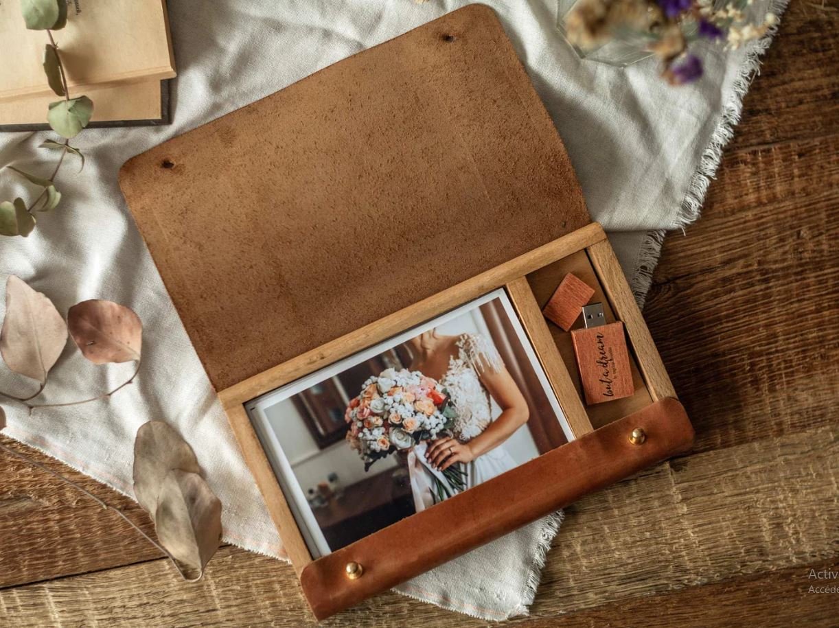 > 1 coffret en bois personnalisé avec 30 tirages en 10 x 15 cm et une clé USB